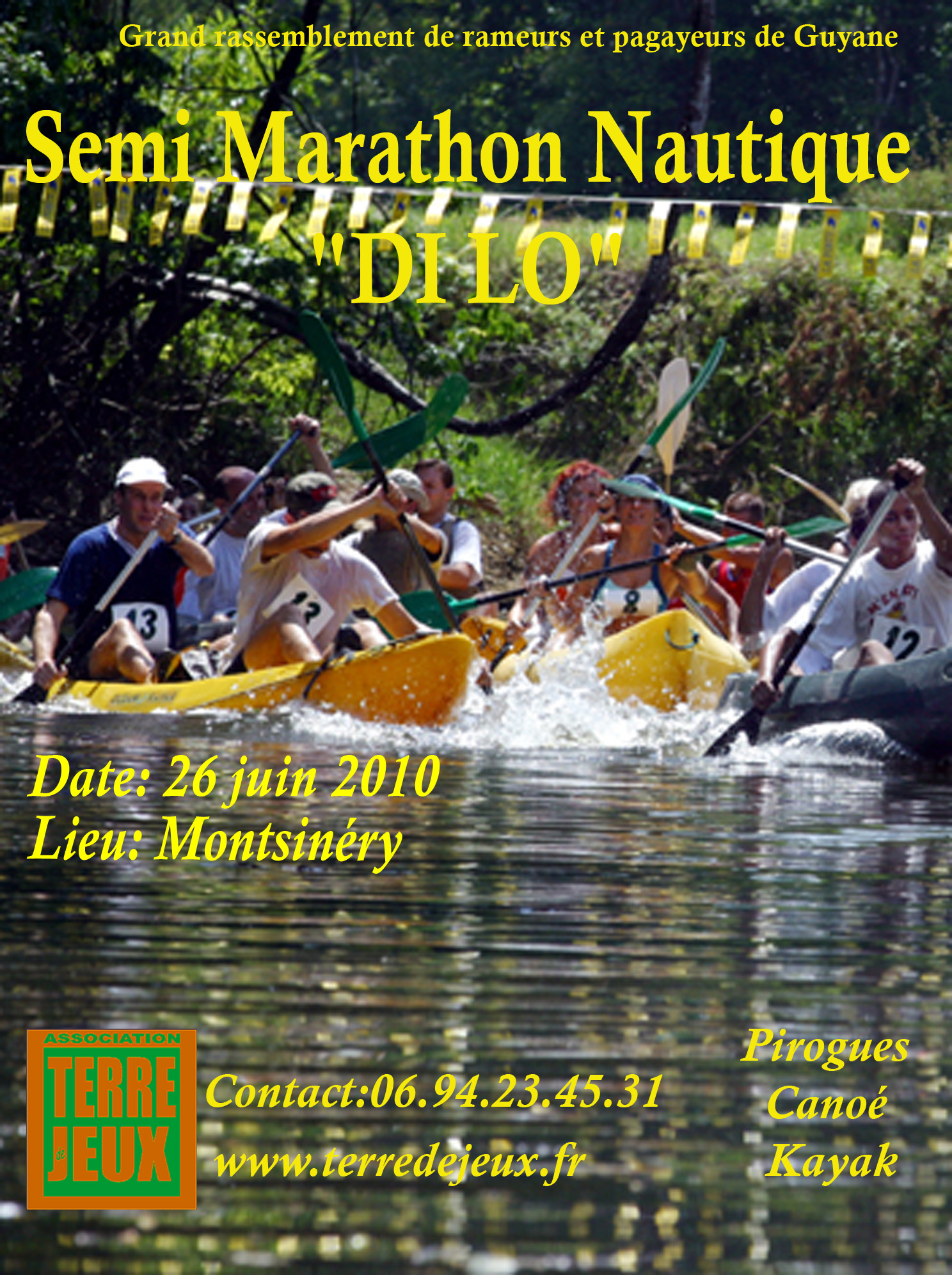Soumis par Didier le 25 mai 2010, 22:19TTerre de jeux innove encore, avec un nouveau défi pour tous les amateurs de pagaie: le 1er Semi-Marathon nautique en Guyane aura lieu au départ de Montsinéry le 26 juin.