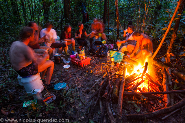 Cela dit, le repas du midi était également très attendu. Regardez tous ces petits saïmiris sous leur bâche alors qu’il ne pleut pas !