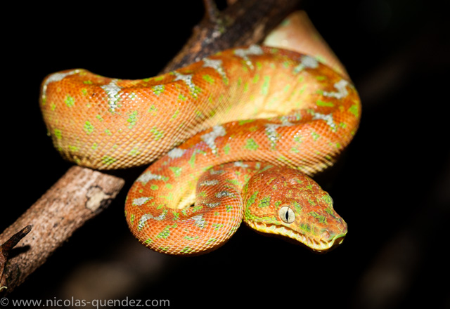 Le problème, c’est que les compères semblent avoir du mal à tenir l’alcool. J’aurais toujours beaucoup de mal à motiver les troupes chaque nuit pour repartir sur l’eau. Tant pis pour eux, la plupart auront ratés ce magnifique boa canin juvénile ! Il devait avoir dans les 6 mois, âge auquel il commence à se teinter de vert, sa couleur définitive une fois adulte !